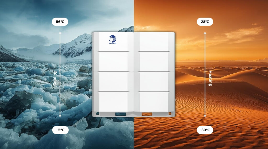 NØRDIS VRF sistemos sukurtos efektyviam darbui ekstremaliomis klimato sąlygomis – nuo –30 °C iki +56 °C. Tai užtikrina patikimą šildymą ir vėsinimą ištisus metus, nepriklausomai nuo sezono ar aplinkos sąlygų.